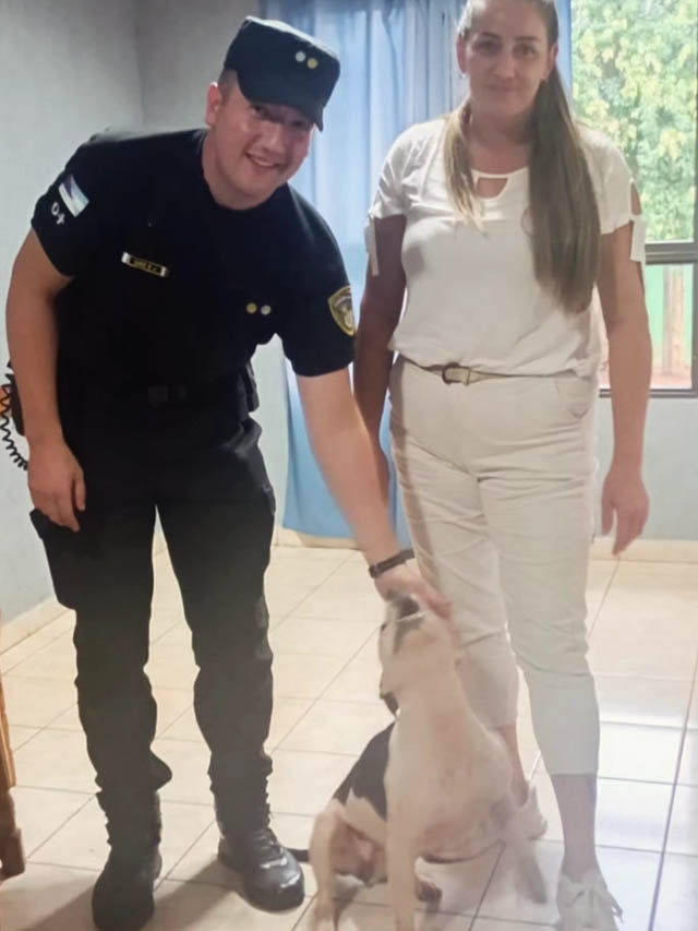 Una perra de raza pitbull llamada “Garona” fue resguardada por efectivos policiales en la localidad de General Alvear, luego de aparecer sola en inmediaciones de la comisaría durante la mañana, sin collar y visiblemente asustada.