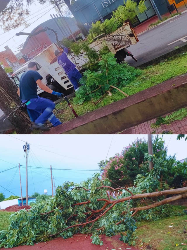 Las tareas incluyeron despeje y apertura de calles, corte y trozado de ejemplares colapsados, recolección de ramas y trabajos preventivos sobre líneas de tendido eléctrico y de comunicaciones. En paralelo, el personal de Defensa Civil realizó un operativo de asistencia y relevamiento en distintos barrios.