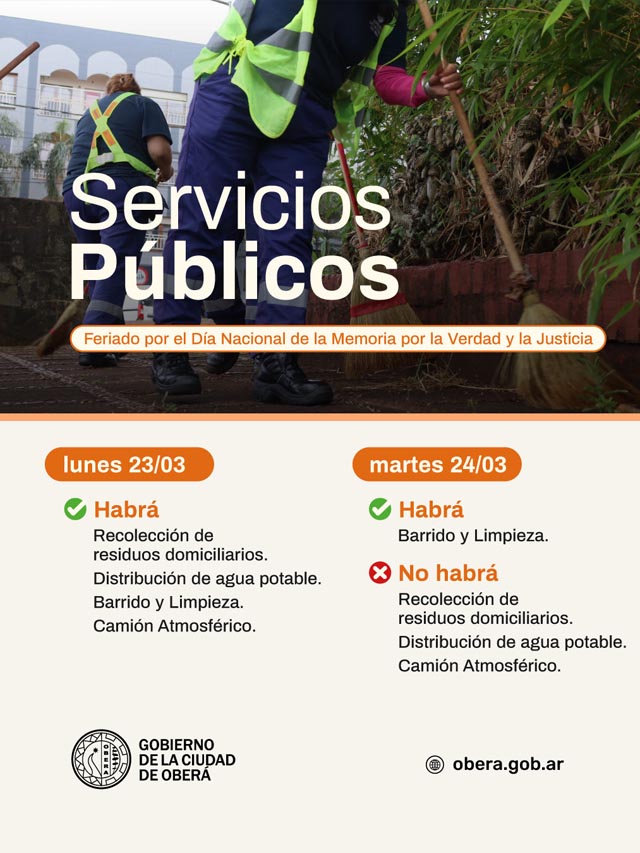 AGENCIA MISIONES.UNO | La Municipalidad de Oberá dio a conocer el cronograma de funcionamiento de los servicios públicos para los días 23 y 24 de marzo, en el marco del feriado nacional.