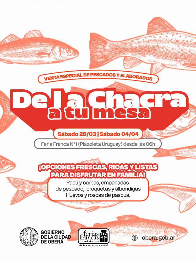 AGENCIA MISIONES.UNO | La Municipalidad de Oberá anunció una venta especial de pescados y elaborados que se llevará a cabo este sábado 28 de marzo y el 4 de abril, desde las 6:00 horas, en la Feria Franca N°1, ubicada en la Plazoleta Uruguay.