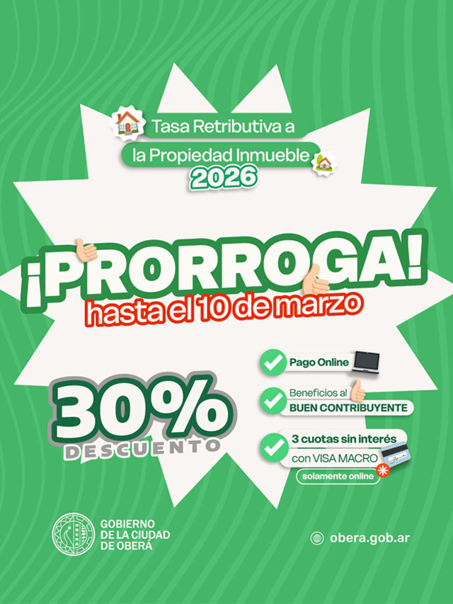 La Municipalidad de Oberá comunicó que se extendió el plazo para el primer vencimiento de la Tasa Retributiva a la Propiedad Inmueble, fijando como nueva fecha límite el 10 de marzo. Esta medida busca facilitar el cumplimiento de las obligaciones tributarias de los contribuyentes y brindar alternativas de pago más accesibles.